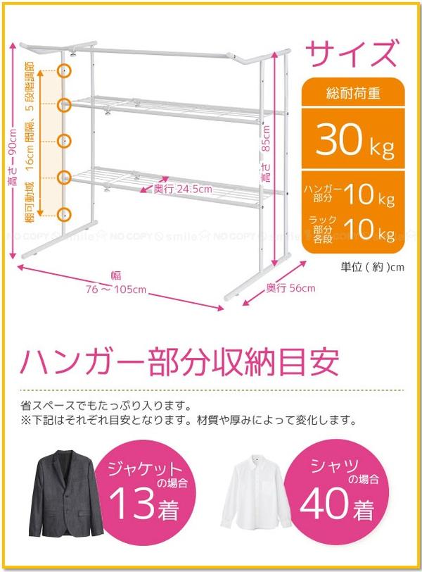 【商品サイズ】 (約)W76.0〜105×D56.0×H90.0cm 【耐荷重】 (約)30kg(棚1段当り10kg×2/ハンガー部10kg) 【材質】 鉄製:エポキシ樹脂粉体塗装 樹脂部品:ABS樹脂 合成ゴム ネジ類:鉄製 メッキ仕上げ [キーワード] 押入れ ハンガーラック 整理棚 ラック 押入れ収納 ハンガー ラック 棚 押入れラック 衣類ハンガーラック