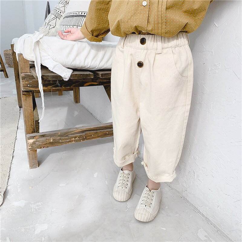 股上深めのゆるシルエットの子供用ロングパンツ。