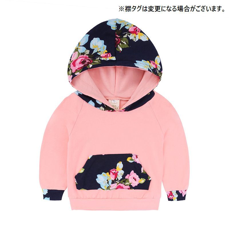 送料無料セットアップ 上下セット 子供服 ベビー パーカー 長ズボン 2点セット 長袖 裾リブ 袖リブ ロングパンツ 女の子 キッズ 赤ちゃん 赤ん坊 トップス ボトムス マフポケット プルオーバー ウエストゴム フード付き 花柄 可愛い おしゃれ お出