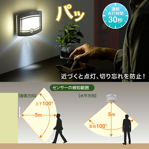 ■照度:30ルーメン■点灯モード:2段階(強・弱)■センサー感知距離:約5m■センサー感知範囲:100°■電源:単三電池×4本■電池寿命目安(1日10回点灯の場合):強光モード約5ヶ月、弱光モード約12ヶ月※乾電池の性能、使用条件により異なります。