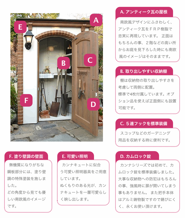 物置 詳細 商品詳細 サイズ W1470×D715(下部)×H1950mm 材質 FRP(繊維強化プラスチック) 重量 125kg 発注区分 注文品 仕様 組立品 カラー ブラウン色 物置 説明 物置 ディーズシェッド・カンナキュート プロバンス風の物置 おしゃれ 洋風のおしゃれ物置 レンガ調デザイン物置大特集 アンティーク調の屋外ものおき FRP製お庭の格納庫 ガーデン収納にディーズガーデンのおしゃれな物置 耐久性に優れた高級物置 送料無料 素敵なお庭に似合う、「見えてもいい」物置。