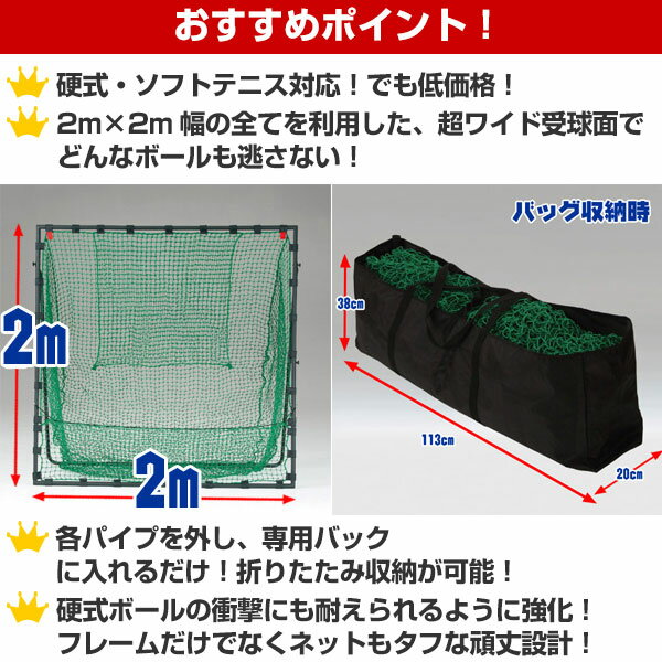 【検索ワード:ラッピング 贈りもの 贈り物 贈物 贈答品 プレゼント ギフト お祝い 記念品 卒業 卒団】プレゼント交換 ギフトボックス】 商品説明 野球用として作られた商品ですが、テニスでもご活用いただけます! 縦横2mのビックサイズで頑丈なフレームで長く使えるネット! ターゲット・固定用ペグ(4本)・収納バッグ付属で、グラウンドでの仕様や持運びもOK! ●前面フレームサイズ:幅200cm×高さ200cm ●組み立て時サイズ:幅200cm×高さ198cm×奥行84cm ●重さ:約17kg ●素材:フレーム/スチール、ネット/ポリエチレン ●立て掛け収納可 ●専用バッグ・ターゲット付 【検索キーワード:テニス用品 テニス練習用品 テニス練習道具 テニス練習器具 テニス練習用具 FIELD FORCE テニスネット 組み立て 組立て 収納 持ち運び 持運び キャリーケース キャリーバッグ コンパクト テニスボール 硬式テニス 軟式テニス ソフトテニス 自立 壁打ち FBN-2020H2 FBN2020H2】 【おもちゃ 玩具 誕生日 子供 ジュニア キッズ】テニス練習用ネット 硬式・ソフトテニスボール対応 2m×2m 専用バッグ・ターゲット付き まずはその大きさをご覧ください(^^) ネットの組み立て方はコチラから
